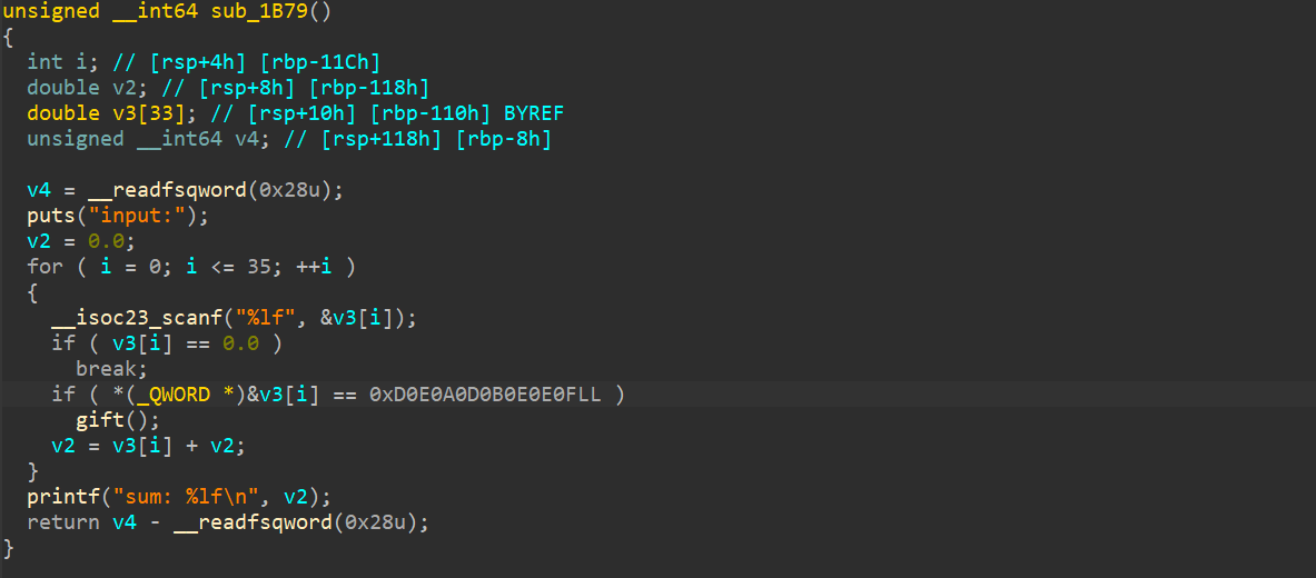 程序主要漏洞在 gift 函数内,但是我们如果想要进入 gift 函数 ,需要使我们输入的浮点数在内存中的 8 字节二进制表示,与 0xD0E0A0D0B0E0E0F 完全相等 。