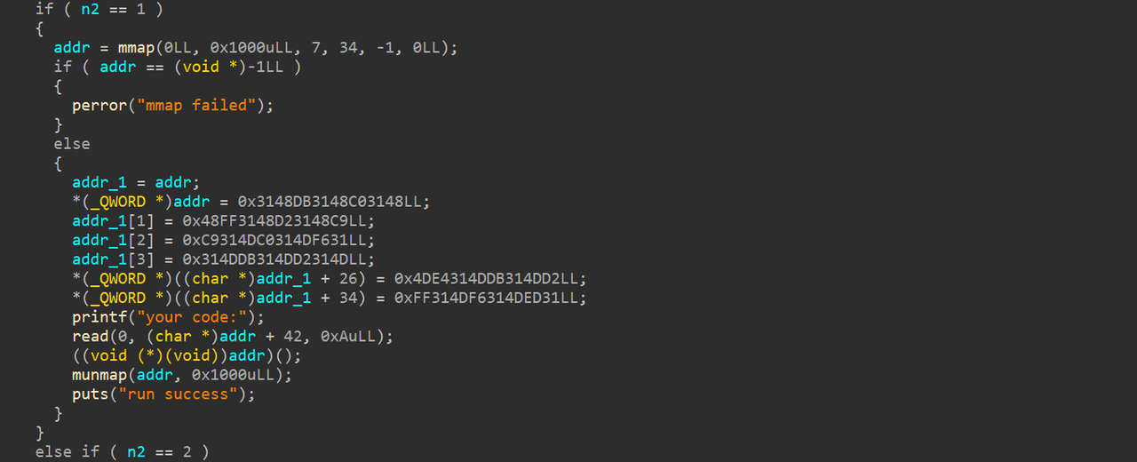 在 gift 函数的选项一内,程序开辟了一个可读可写可执行的内存空间,并且在该内存空间的起始部分注入一些数据,经过调试发现,该数据的主要作用其实是对寄存器进行清空操作 ,清空了除去 RBP 和 RSP 之外的其他寄存器,程序还给我们提供了 10 字节的有限输入空间,但由于输入字节数有限,我们无法对目标 shellcode 进行直接构造,所以我们需要想办法拼凑出 read 函数的系统调用,来实现 shellcode 续写 。