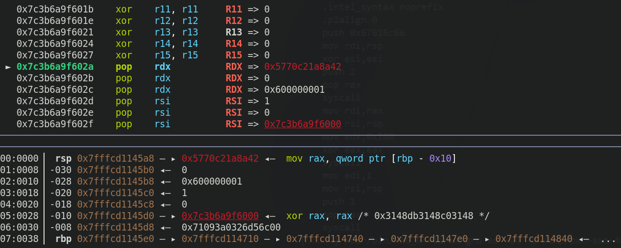 当寄存器全0时,只需要执行一次syscall,就会把返回地址rip赋值给rcx寄存器,rcx寄存器就会有rwx地址,然后再mov rsi,rcx;mov dl,0xff;syscall,就会reread